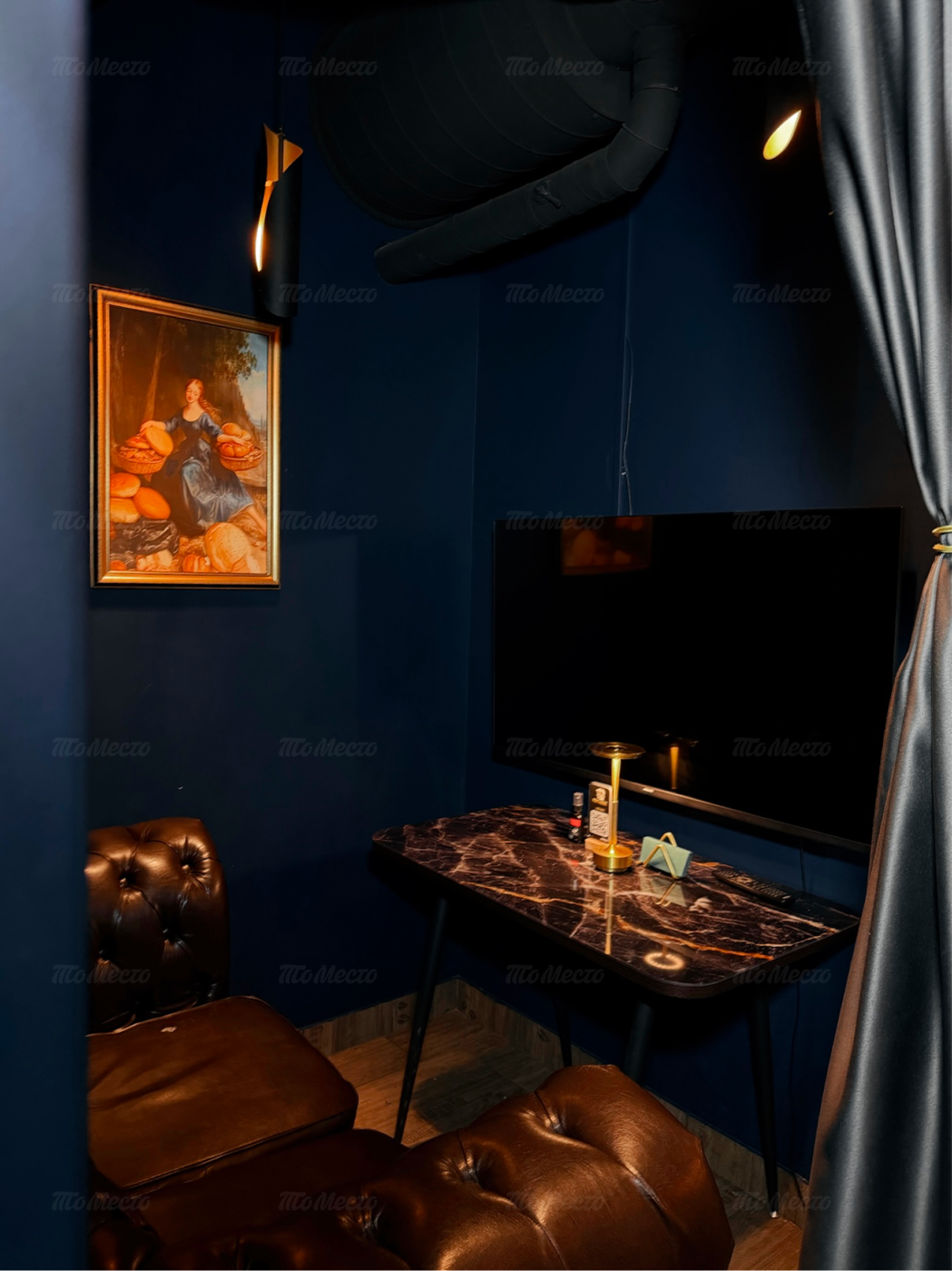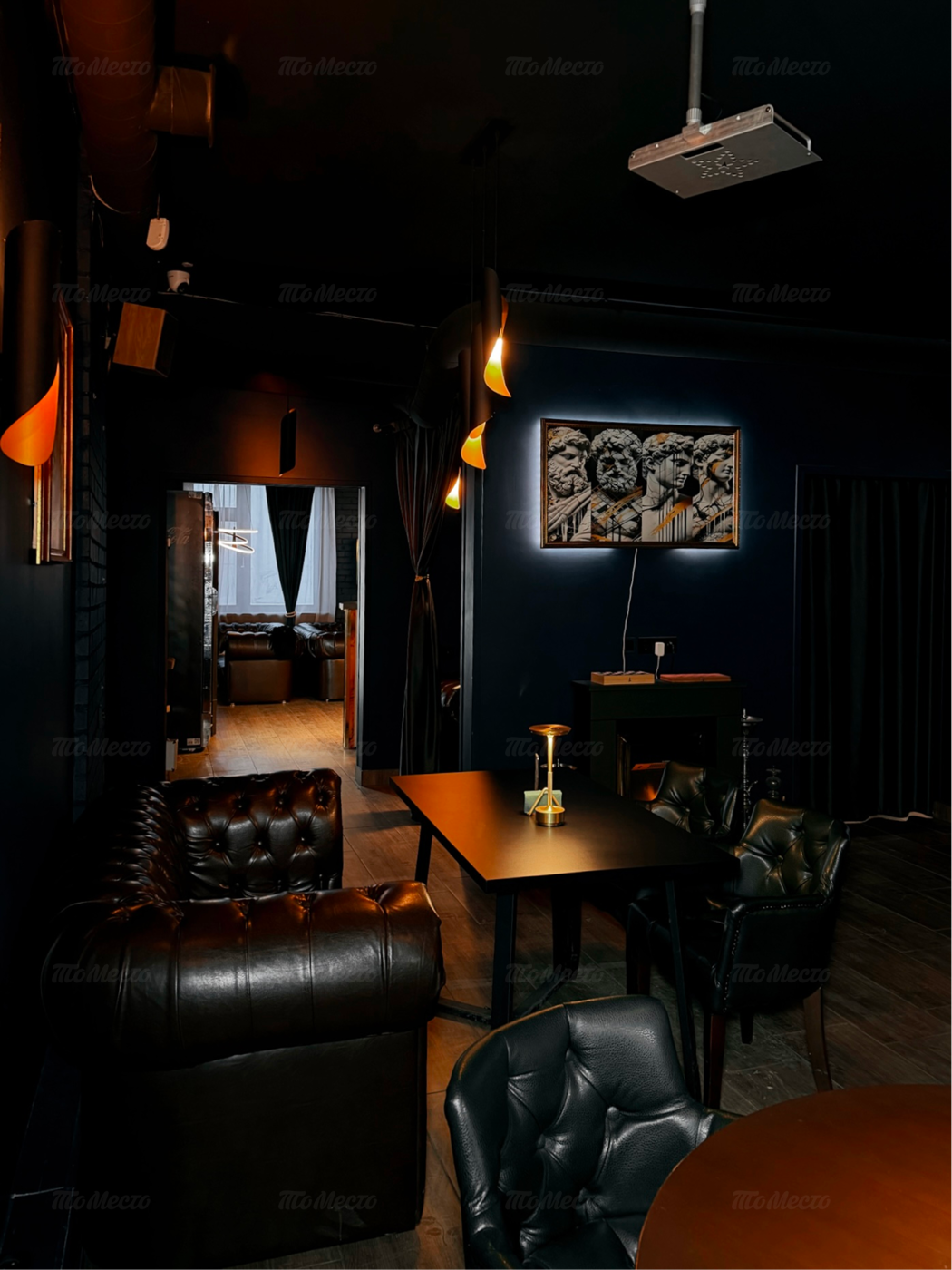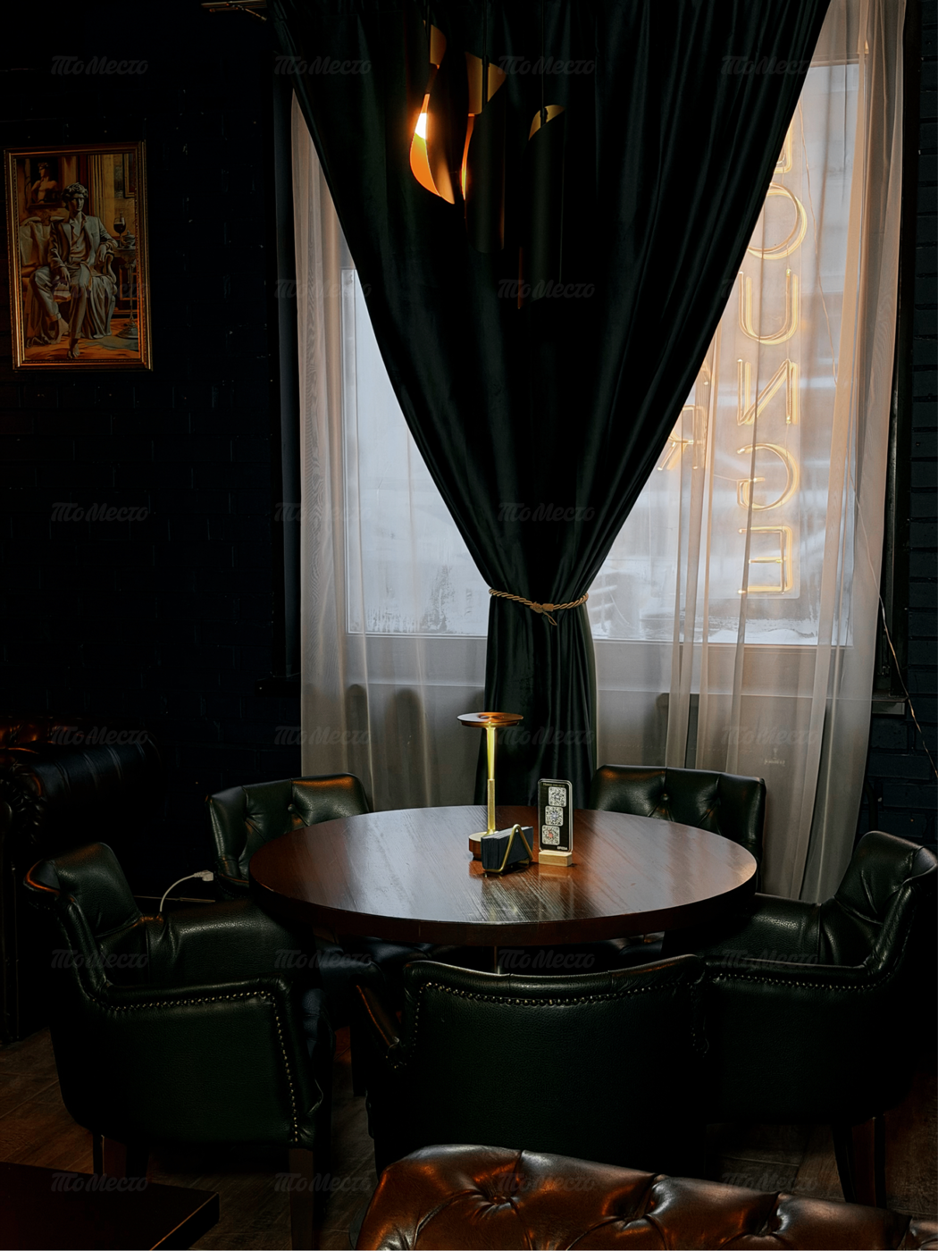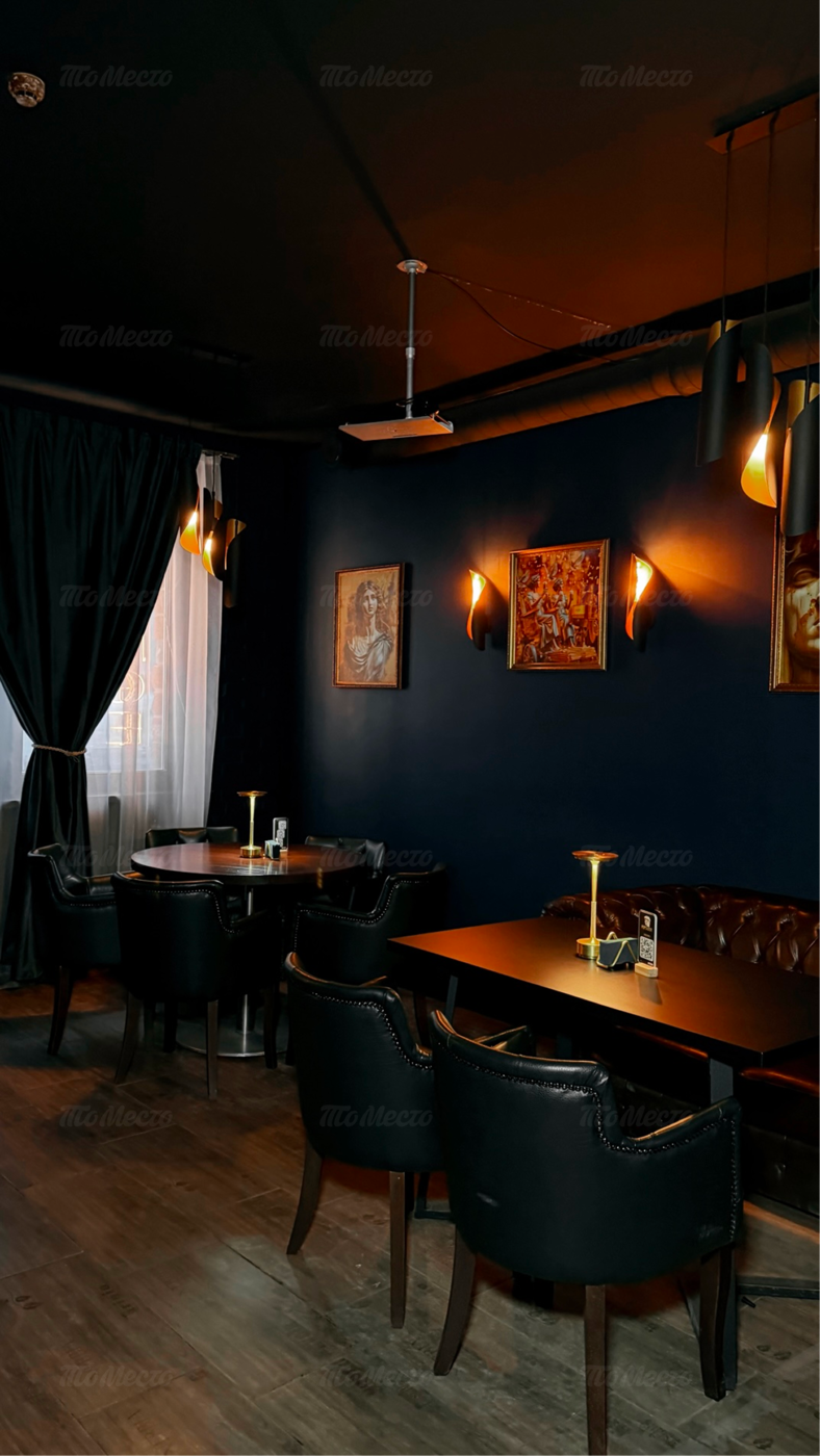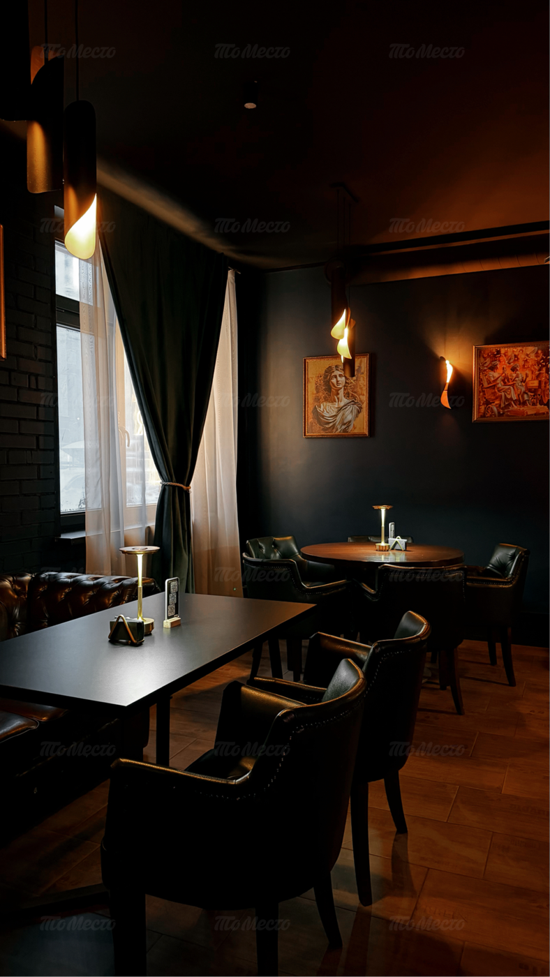 Пространство разделено на три зала, интерьер которых сочетает британскую классику и элементы лофта. Основу палитры составляют тёмные оттенки, создающие камерное настроение. Гости располагаются в глубоких креслах и на диванах, а внимание притягивает барная стойка с мягкой подсветкой, украшенная репродукциями известных картин. Приглушённый свет и детали оформления бара задают атмосферу для неспешных разговоров и отдыха.